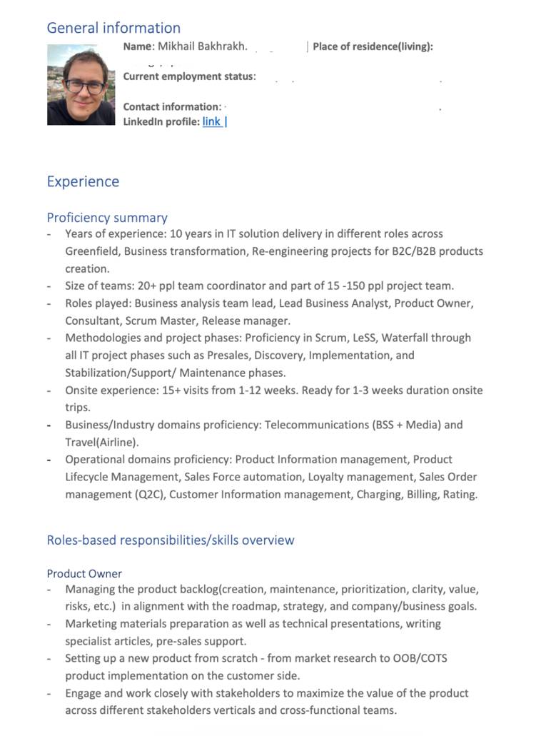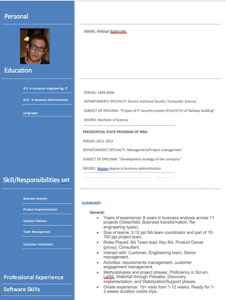 Моё второе резюме я подготовил после нескольких лет работы в своей первой ИТ-компании. К этому моменту я уже имел актуальный опыт работы бизнес-аналитиком, который я стремился грамотно представить, и также уделил внимание дизайну резюме. Однако, я не учёл важность компактности: документ получился объёмным на 11 страницах. Включив в него весь свой опыт и все места работы, я понял, что такой подход, возможно, не был лучшим решением. Вот как оно выглядело: