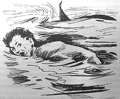 Перегнувшись через борт, он вглядывался в спокойную глубину моря. Лицо у Смуги побледнело. Заинтересованные возгласом Смуги, капитан Новицкий и Томек подбежали к нему. Смуга молча протянул руку вперед. Друзья посмотрели по направлению его руки и замерли от ужаса. На некотором расстоянии от яхты, на небольшой глубине, медленно двигалась серовато-голубая, грозная тень похожая сверху на вытянутое веретено. Форма головы, приплюснутая и выдвинутая вперед словно длинный клюв, треугольные плавники на спине, из которых передний был больше заднего и крупные, широкие серповидные грудные плавники, позволяли сразу же определить опасную, хищную акулу .
