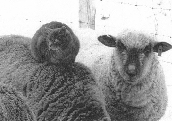 Айла кошка, спасенная Пип, устроилась на теплой, шерстяной спине овцы в холодный зимний день