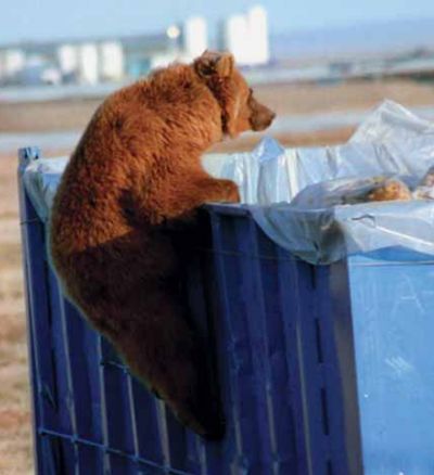 Бурые медведи отчаянные обжоры и лакомки. Для того, чтобы медведи и люди могли безопасного сосуществовать, у зверей не должно возникать ассоциаций между возможностью вкусно поесть и человеческим запахом. Отучить медведя-мусорщика от потребления пищевых остатков со стола человека почти невозможно: теряя страх, он, как правило, становится мародером и убийцей.