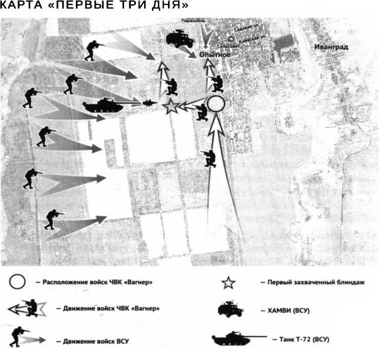 Слева от нас, строго на запад, в полях работал пятый штурмовой отряд «Пятерка». Наш штурмовой отряд вклинивался между ними, чтобы дать им возможность не растягивать свою линию фронта и продолжать концентрированное наступление по своим направлениям. Справа в Опытном фронт уже продвинулся чуть дальше этой позиции, и нашей тактической задачей стало выравнивание его с соседями. Впереди были стела, стоявшая на въезде в Бахмут, и автозаправка «Параллель». Справа было Опытное, а слева поля и посадки с разветвленной системой обороны, созданной ВСУ в ожидании штурма. Впереди, в двух километрах по прямой, находилась «фортеция Бахмут», как ее называли пропагандисты украинских СМИ.