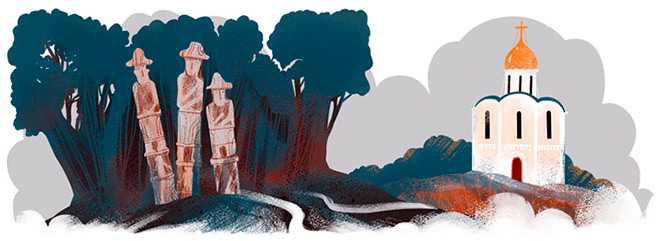 В городах возводили прекрасные белокаменные храмы. А рядом с городами, в лесах и рощах, люди устраивали капища места, где поклонялись языческим богам.
