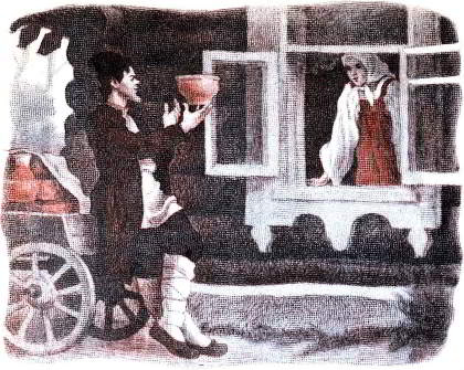 Брат ушёл, Дуня села у окна покрасоваться. Мимо горшечник едет:
