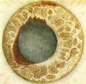Рис. 18. Эссенциальная прогрессирующая мезодормальная дистрофия радужки, I стадия (выворот пигменной каймы зрачка).
