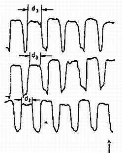 Принцип действия прибора заключается в следующем. Изображение зрачка глаза, подсвечиваемого невидимым пучком света, с помощью проекционной оптической системы сканируется относительно чувствительного слоя фотоприемника по синусоидальному закону. В результате с выхода фотоприемника снимаются электрические импульсы, длительность которых пропорциональна размеру диаметра зрачка. Последние усиливаются и на регистрирующем устройстве фиксируются в виде серии импульсов (рис. 34).