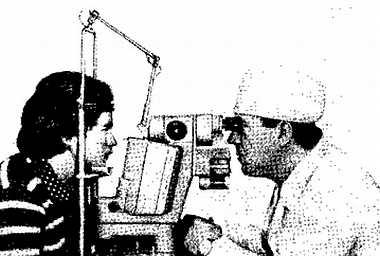 Больной располагается напротив врача, голова фиксируется за счет подбородка и неподвижного налобника. Зажимная клавиша дает возможность легко и быстро установить нужную для осмотра высоту. Больной широко раскрывает глаза и направляет свой взгляд на фиксирующую лампу (рис. 28).