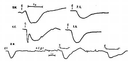 Рис. 30. Образцы записи пупилллограмм при световой вспышке для разных индивидуумов.