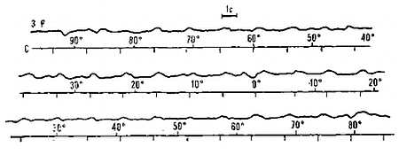возбуждение, создаваемое отдельной световой вспышкой, формируется ограниченным участком сетчатки, связанным со своими единичными пупилломоторными волокнами, то представляется возможность дифференцированного исследования пупилломоторного тракта на уровне отдельных групп волокон и, возможно, отдельных групп сегментов сфинктера. На рис. 32 представлены образцы пупиллограмм с разных участков сетчатки при сканировании ее световой вспышкой с частотой 1 Гц по горизонтальному меридиану.