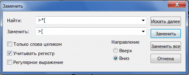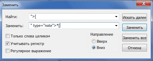 Нет, мы все же можем победить FBE. Открываем страницу кода. Опять же используем «Заменить»: Правка Заменить. Найти следующие символы: ">[ Но замена иная: " type="note">*[ Звездочка не даст FBE зациклиться, поэтому смело жмем «Заменить все».