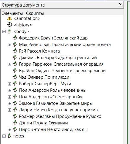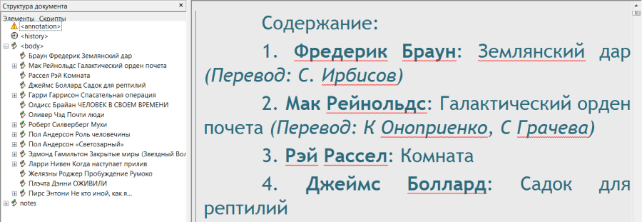 Левая панель «Структура документа» ясно показывает нам, что для начала следует исправить заголовки рассказов привести все к единому виду. То есть имя автора, потом фамилия, а названия рассказов, как в предложениях с большой буквы.