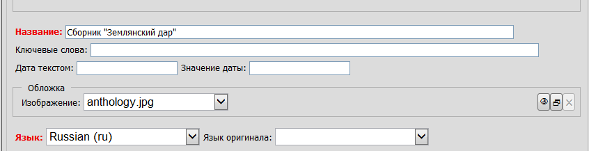 Язык уже указан. Можно указать язык оригинала (выбрать из списка), если произведения сборника переводные. А если перевод с нескольких языков? Тогда оставляем незаполненным.