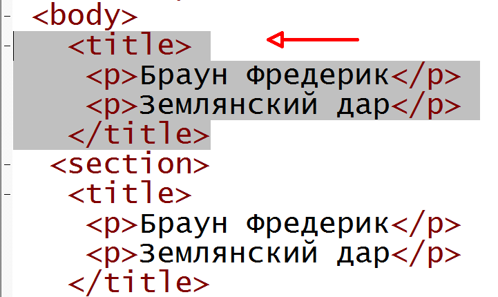 Копируем название первого рассказа выделяем так, как показано на картинке, и вставляем сразу после тега body.