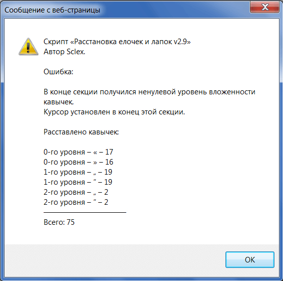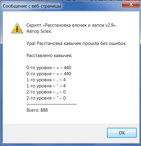 Снова запускаем скрипт. Теперь он останавливается не из-за ошибки, а потому, что несовершенен «не понимает», что в кавычках может и не быть слов. Добавьте в начало какую-нибудь букву, только не забудьте ее удалить после удачного завершения расстановки кавычек.