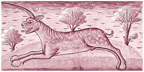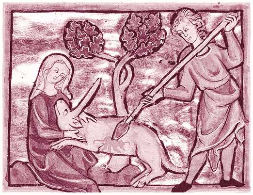 Подобная интерпретация не играет никакой роли в религиозном представлении священной охоты на единорога, где на первый план выходит либо самопожертвование Христа, либо непорочность Марии. Однако чистота и целомудрие, а значит, и роль девственницы находят отражение и в придворных представлениях об идеальной любви. Это с некой иронией отражено у Рудольфа Эмсского, который в «Мировой хронике» (середина XIII века) объясняет встречу с единорогом как своего рода испытание девственности. Для начала он описывает животное в соответствии с традицией естествознания, о которой мы рассказывали в , как чрезвычайно дикое гибридное существо, встречающееся в Индии: «[В Индии] есть также единорог, который не подвластен ни одному человеку в мире, настолько он силен и быстр. Тело лошади, голова оленя, ее он поднимает враждебно высоко. Поведение недружелюбное. У него ноги слона