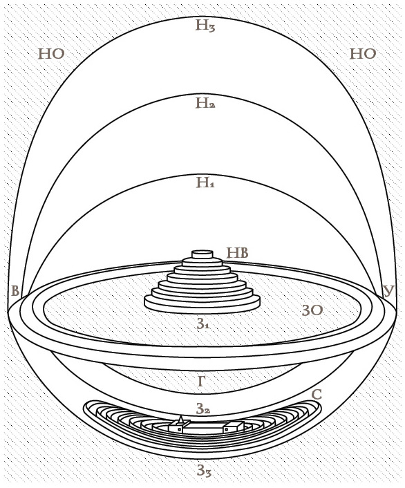 Небесный свод насчитывал семь ярусов, по которым двигались Солнце, Луна, Венера, а также другие планеты и звезды. Свод опирался на горы и отделялся от земли воздушным пространством . Нижнее полушарие под землей образовывало потусторонний мир, «страну без возврата», где обитали души умерших.