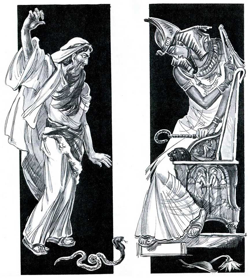 Слуги удивились: до сих пор фараон никогда никому не подавал руки. Моисей вынул свою руку из-за пазухи, и все увидели, что рука у него как мёртвая. Задрожали пальцы фараона, зазвенели золотые кольца на них. Слуги бросились к фараону и подхватили его. В глазах у фараона потемнело, и, словно издали, услышал он голос Моисея.