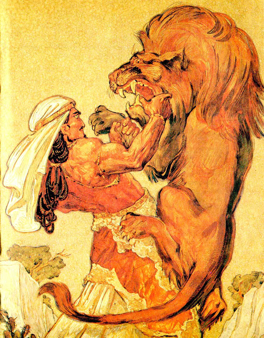 Лев вышел из кустов и пошёл прямо на Самсона. Остановился, глядит на него в упор, когтями землю царапает. Потом низко-низко пригнулся к земле и прыгнул!