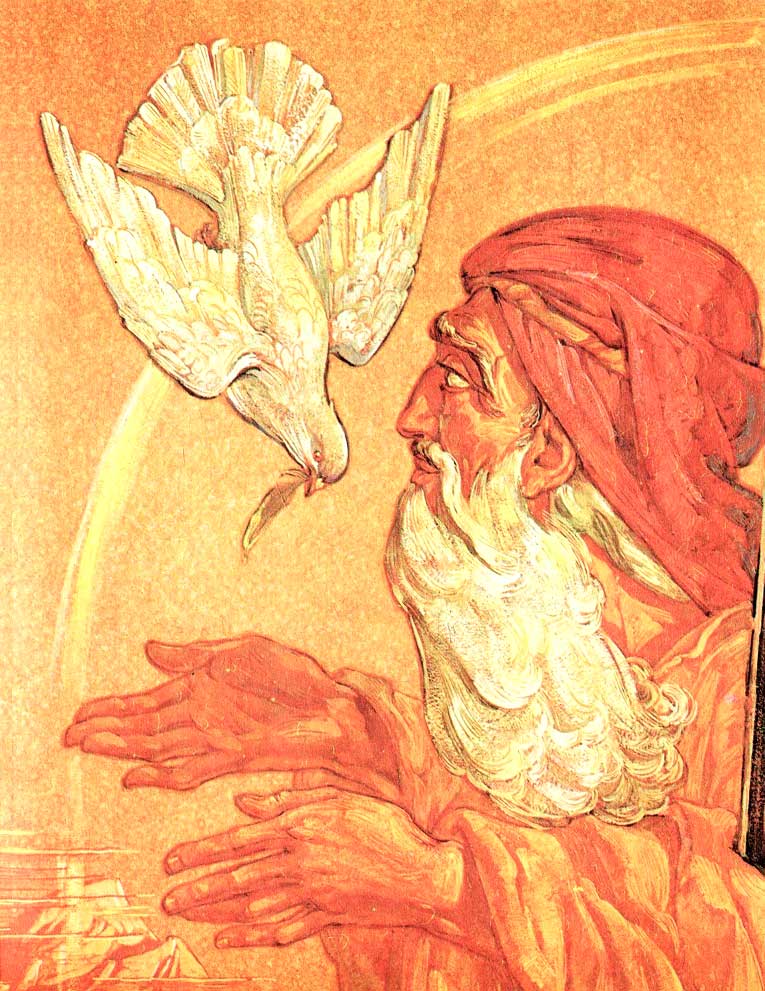 Утром опять улетел голубь. Долго ждал его Ной. Солнце опустилось в красные воды. Видит Ной летит к нему голубь и зелёный масличный лист держит в клюве. Понял Ной, что где-то есть сухая земля.