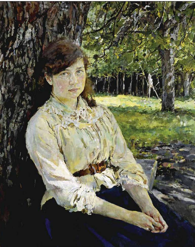 Сидящая под деревом девушка окутана узорным кружевом листвы, пронизанной солнечным светом размеренного и ленивого летнего полдня. Ее лицо спокойно, поза расслаблена и женственна, она словно находится в царстве покоя и отдыха. Ажурные переливы солнечных бликов, которыми залиты кожа и блузка героини, прописаны почти мозаичными мазками и создают контраст неожиданно мягкой бархатистости сине-фиолетовой юбки. И вновь Серову невероятно точно удалось передать несколькими длинными мазками бархатный отлив ткани. В полотне прослеживается совсем иной темп жизни, чем в написанной годом ранее «Девочке с персиками». Эти два произведения словно перекликаются между собой, подобно живописным аллегориям, детство и юность, беззаботная шаловливость и мечтательная созерцательность.