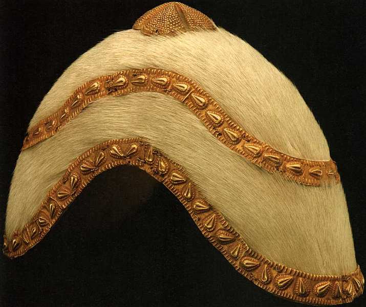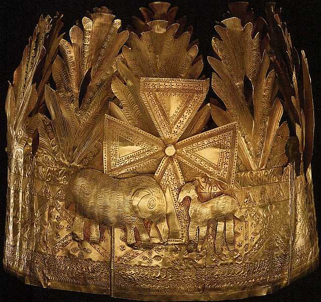 Представленный ритуальный убор сделан из кожи антилопы альбиноса, украшен кованым орнаментом с элементами золотого литья. Народности акан дорожат своими древними традициями, они стремятся сохранить память о них, знают тонкости ритуалов, поддерживают производство культовых объектов, внимательно следуя символике и логике обрядов, сохранившихся в неизменном виде с XV века. Эти племена вели очень активную торговлю, их страна была могущественной и богатой. Путешественники XVII столетия описывают регалии, церемониальные и статусные украшения, которыми гордились акан. В настоящее время подобные щедро украшенные предметы составляют национальное достояние народа, их используют только в самых торжественных случаях.