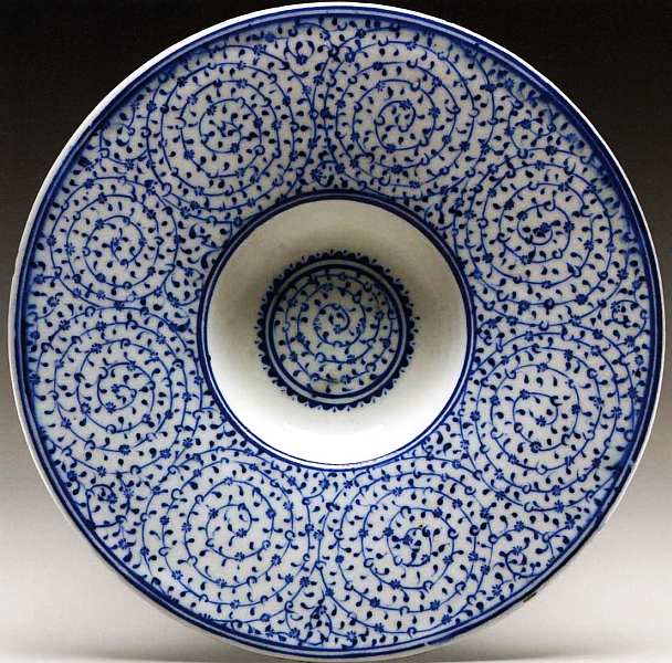 Это небольшое блюдо прекрасный образец эпохи расцвета изникской керамики. Специалисты называют такой тип орнамента скручивающиеся стебли с листьями «Золотым Рогом» по месту обнаружения большого числа похожих фрагментов на южном побережье Золотого Рога, разделяющего территорию Стамбула. Прочность глазури позволяла сохранять роспись свежей и яркой, поэтому у керамики было еще одно название «Не блекнущие цветы рая». Производство такой посуды в технологическом плане довольно сложно и трудоемко. Изделия стоили очень дорого и не предназначались для практического использования. Они до сих пор украшают интерьеры дворцов и мечетей. Именно изникская керамика принесла турецкому декоративно-прикладному искусству мировую славу.