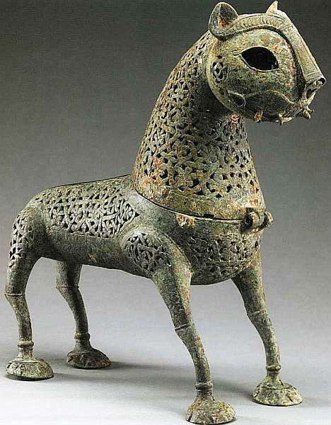 Данное произведение интересно тем, что мастер представил фигуру животного. Как уже отмечалось, в исламе действовал запрет на изображение человека и зверей, художественное творчество позволялось лишь в области абстрактных линий орнамента. Он объяснялся тем, что антропоморфные образы могут привести к идолопоклонничеству. Ведь уважение и почтение приличествует только Аллаху. Изображения были запрещены еще и потому, что являлись некой попыткой состязаться с Аллахом в творении и, конечно, из-за опасности искушения, таящегося в образах обнаженных женщин. Однако в светском мире в областях декоративно-прикладных предметов и книжной иллюстрации изобразительное искусство в общепринятом европейском смысле этого слова нашло свою нишу. Часто представляли тех животных, к которым формально трудно было предъявить обвинение в том, что им пытаются поклоняться. Самые популярные среди них грифоны и львы. Эта работа прекрасный пример распространенной в XII веке декоративной утвари. Здесь проявляется общая тяга исламского искусства к утонченной орнаментальности. Формы сосуда достаточно лаконичны, однако прорезанные отверстия делают поверхность нарядной. Так, простыми средствами неизвестный мастер добивается
