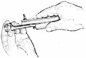 4) Присоединить затвор к затворной раме. Вставить затвор цилиндрической частью в канал затворной рамы; повернуть затвор так, чтобы его ведущий выступ вошел в фигурный вырез затворной рамы, и продвинуть затвор вперед до отказа.