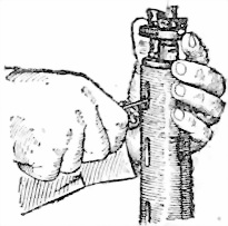 8) Отделить ствольные накладки. Прижать замыкатель верхнего упорного кольца к газовой трубке до выхода отгиба замыкателя из выреза кольца и повернуть замыкатель вправо до отказа (рис. 10, а ); сдвинуть перемещающуюся часть верхнего упорного кольца вперед; нажимая ствольную накладку вниз и отводя в сторону, отделить ее от ствола. В случае затруднительного отделения ствольных накладок вставить вырез ключа пенала в окно накладки (рис. 10, б ) и движением вниз и в сторону отделить ствольную накладку.