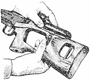 7) Присоединить щеку приклада. Наложить щеку на верхнюю часть приклада застежкой вправо против выреза для нее; надеть петлю на зацеп обоймы и повернуть застежку вверх.