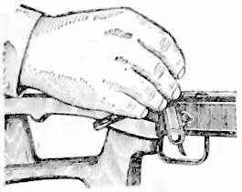 7) Отделить ударно-спусковой механизм. Повернуть предохранитель вверх до вертикального положения (рис. 9, а ) сдвинуть его вправо и отделить от ствольной коробки; взявшись за спусковую скобу (рис 9, б ), движением вниз отделить ударно-спусковой механизм от ствольной коробки.