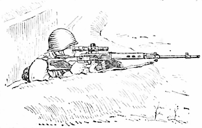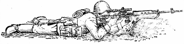 115. Для стрельбы из-за дерева, угла здания и других укрытий принять положение для стрельбы, прислониться к укрытию так, чтобы оно защищало снайпера от огня противника; винтовку удерживать так же, как при стрельбе без укрытия (рис. 63). Винтовка и поддерживающая ее кисть руки не должны касаться укрытия во избежание отклонения пуль в сторону.