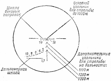 Сетка прицела служит для прицеливания; она сделана на стекле, укрепленном в подвижной рамке (каретке). На сетке прицела (рис. 35) нанесены: основной (верхний) угольник для прицеливания при стрельбе до 1000 м; шкала боковых поправок; дополнительные угольники (ниже шкалы боковых поправок по вертикальной линии) для прицеливания при стрельбе на 1100, 1200 и 1300 м; дальномерная шкала (сплошная горизонтальная и кривая пунктирная линии).