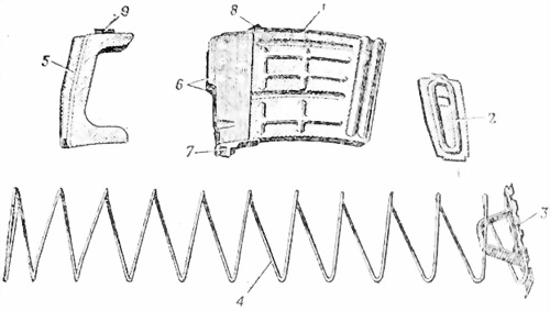 1 корпус; 2 крышка; 3 стопорная планка; 4 пружина; 5 подаватель; 6 загибы; 7 зацеп; 8 опорный выступ; 9 выступ подавателя