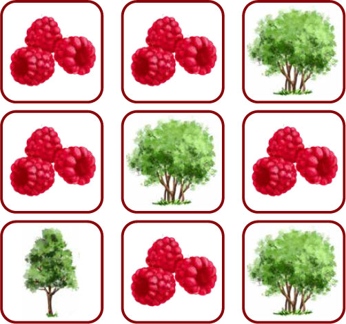 Например, на столе разложены в первом горизонтальном ряду: малинка-малинка-дерево.