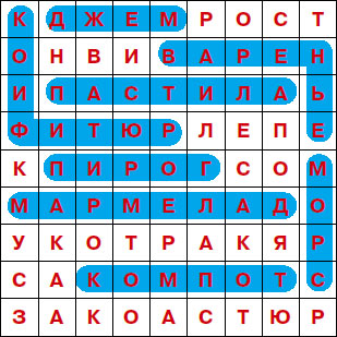 Малыш (вставьте имя ребенка, которому читаете. Прим. автора), а ты любишь сладости? Отыщи в этом квадрате названия блюд и вкусностей, которые можно изготовить из ягод. Зачеркивай разными цветными карандашами или фломастерами каждое найденное слово.