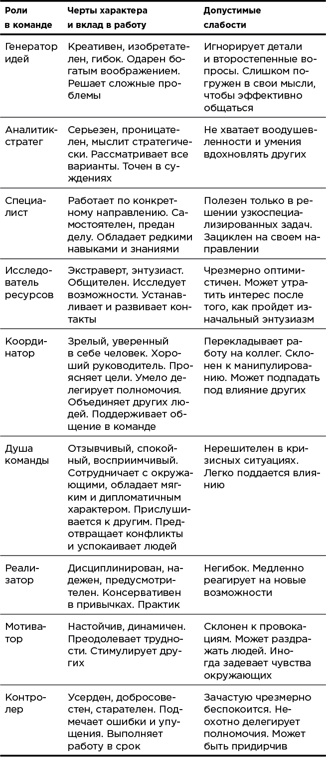 Выявить командные роли участников. Это делается через комплексный тестовый анализ, который выявляет три аспекта, значимых для разных ролей: интеллект, мотивацию, личность.