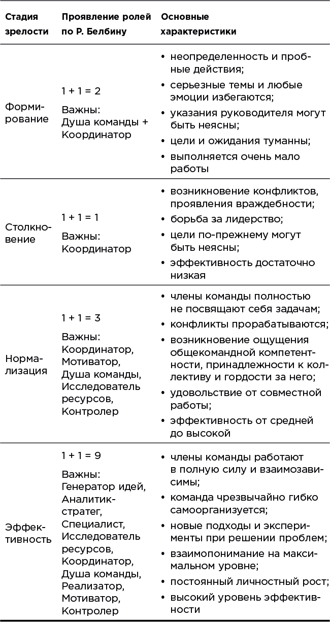 В качестве шпаргалки по стадиям зрелости команды, проявлению в них ролей и характерным особенностям на каждом этапе лидерам будет полезна следующая наглядная таблица: