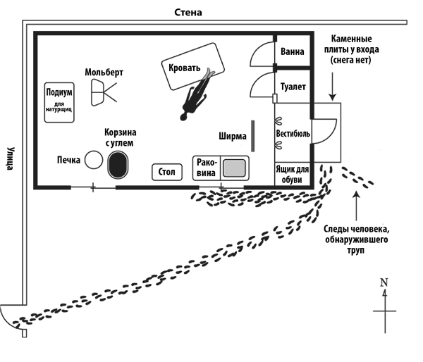 Следы лишь слегка припорошило. Из этого следует, что двое вошли в мастерскую по меньшей мере за полчаса до половины двенадцатого, когда снегопад прекратился, и вышли из нее в промежутке между половиной двенадцатого и половиной девятого следующего утра. Сначала женщина, потом мужчина. Почему я утверждаю, что они вошли в мастерскую за полчаса до окончания снегопада? Потому что следы были занесены лишь слегка.