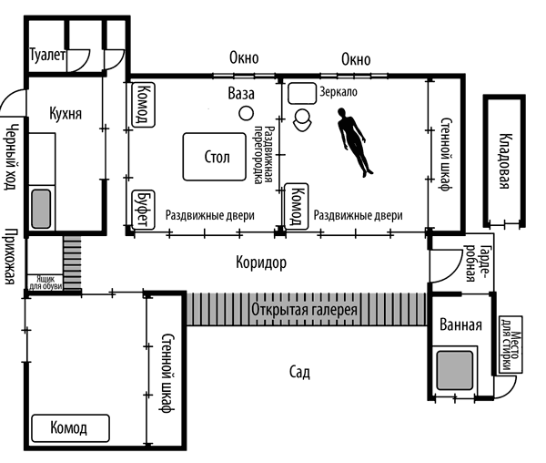 Судя по рисунку, сбоку от трюмо была раздвижная перегородка. Если Кадзуэ сидела лицом к зеркалу, прямо за спиной у нее была еще одна перегородка, отделявшая комнату от коридора. Грабитель мог проникнуть в комнату, где находилась Кадзуэ, либо из соседней комнаты, отодвинув перегородку, либо из-за спины женщины, из коридора. Других путей у него не было.