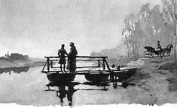 Они подъехали к разлившейся реке, которую им надо было переезжать на пароме. Пока устанавливали коляску и лошадей, они прошли на паром.