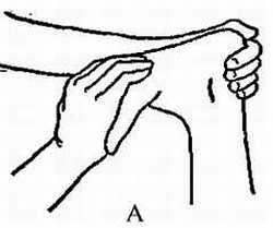 Руку массируемого поднимите, согните в локте и свесьте с другой стороны шеи. Верхняя часть руки массируемого должна быть в вертикальном положении. Обхватите ее у локтя двумя руками и, крепко сжимая, двигайте руки к плечевому суставу.Поднимание плеч
