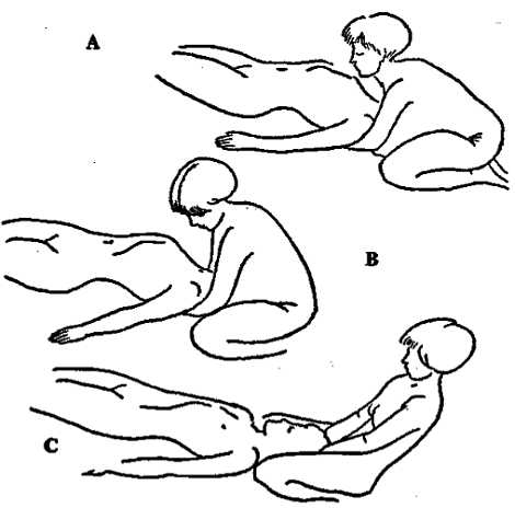 В выполнении этого приема участвует массируемый. Он должен немного приподнять голову, чтобы массирующий мог как можно дальше подсунуть руки ему под спину. Ладони нужно расположить вдоль позвоночника (А). Массируемый должен расслабиться, и как только это произойдет, начните движение рук вверх вдоль позвоночника (В). Руки надо сложить в виде ковшика и очень медленно двигать вдоль позвоночника, по шее и задней части головы (С). Выполнение приема заканчивается движением ""Вырывание" волос".Если массируемый очень тяжел или гораздо выше массирующего, этот прием массажа можно исключить.