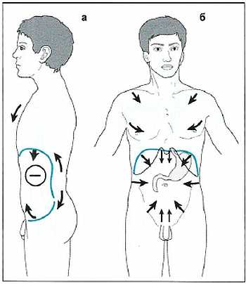 Рис. 2.9 а,б. «Тенденция к раскрытию» при экспансивных процессах в животе