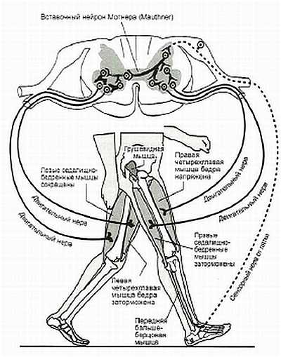 Еще один физиологический принцип играет важнейшую роль в паттернах позы и движения: рефлекс перекрестного растяжения. Он относится к рефлексу «бей или беги». Например, раздражение подошвы правой стопы болевым импульсом вызывает сгибание стопы, колена и тазобедренного сустава. Одновременно через вставочные нейроны стимулируются разгибатели левой ноги.