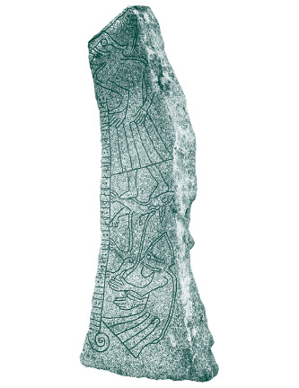 Ледбергский рунический камень, расположенный в Остергетланде, Швеция. Считается, что на нем изображен Фенрир, пожирающий Одина.