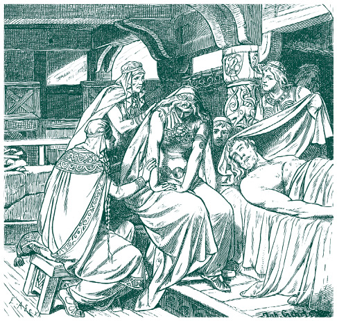 Гудрун оплакивает Сигурда. Гравюра Иоханнеса Герца.