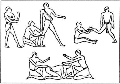 Но массаж применяли не только при дворе фараона и в среде египетской знати как средство ухода за телом и борьбы с усталостью после длительных пеших переходов или тяжелых работ, он использовался крестьянами-земледельцами и рядовым воинским составом египетской армии [48]. При раскопках в 1841 году могилы египетского полководца был найден папирус с изображением массажных приемов, которые как иллюстрация из современного учебника: различимы типичные движения массажиста, например, массаж коленного сустава, массаж стопы и голеностопного сустава, парный массаж спины, прием поколачивания и, наконец, самомассаж плеча.