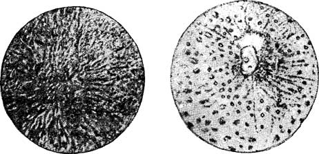 Через 38 минут после оплодотворения картина меняется. Цитоплазматическая зернистость собрана лучами вокруг центральной точки яйца. На концах «лучей» лежат мельчайшие зёрнышки ядерного типа (рис. 7).