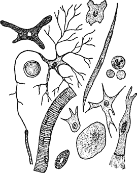 В зависимости от того, какую роль выполняют те или иные клетки в целом организме, они имеют соответствующий характер своего строения. Мышечные волокна, клетки крови (красные и белые кровяные шарики), клетки кожи все они резко отличаются друг от друга как по форме своего строения, так и по той работе, к которой приспособлена и которую выполняет данная клеточная форма (рис. 2).
