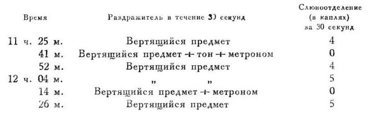 О пыт 15 II 1910. Вертящийся предмет - условный пищевой раздражитель, тон - условный тормоз к нему, метроном посторонний агент.